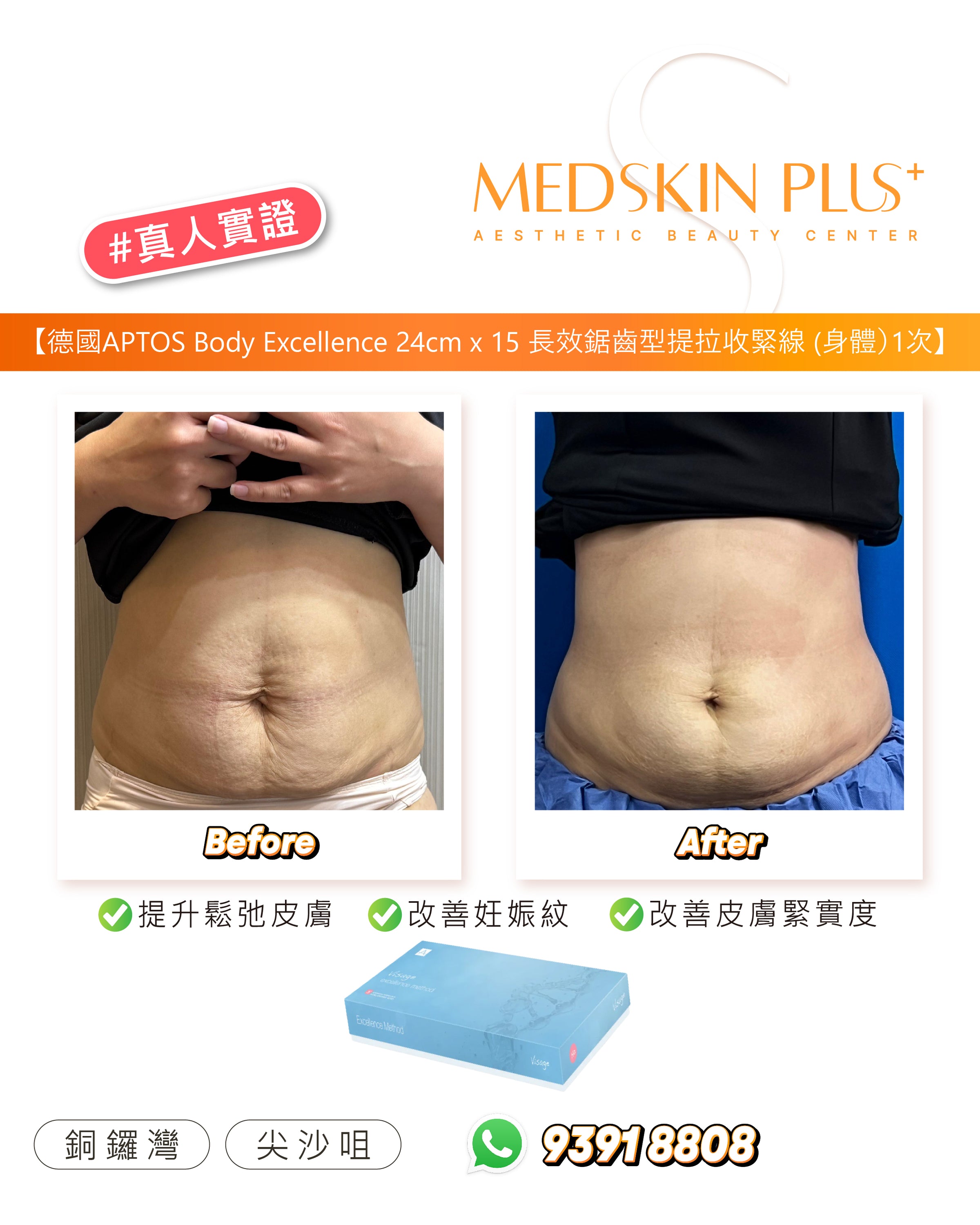 植入後,伴隨膠原重建與微血管刺激,膚質、彈性與緊緻感同步提升,整體效果維持長達 2–3 年以上。看看MEDSKIN PLUS客戶在完成APTOS埋線的前後對比: