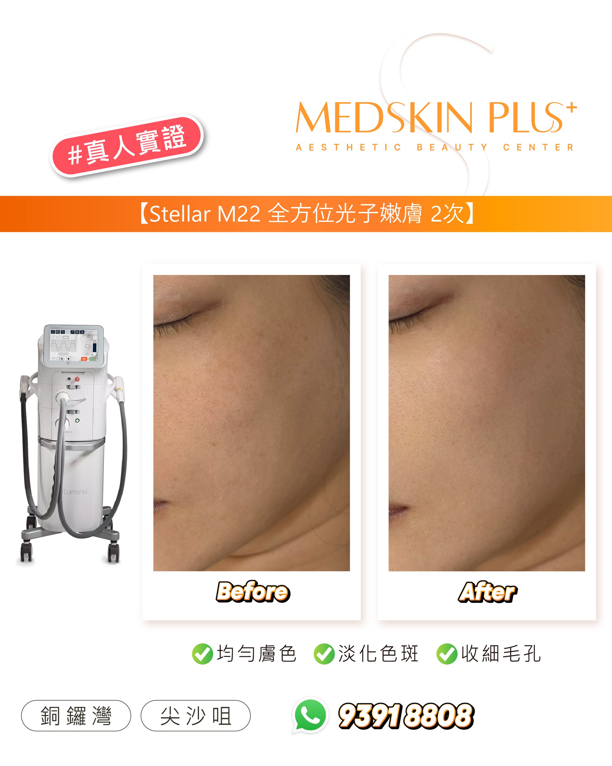 Stellar M22 有效解決30多種皮膚問題,包括:日曬色斑、荷爾蒙斑/ 肝斑、老人斑、雀斑、暗瘡、微絲血管及擴張引起的紅印等。亦可調整皮脂腺分泌、嫩白提亮膚色、收細粗大毛孔、嫩膚緊緻。