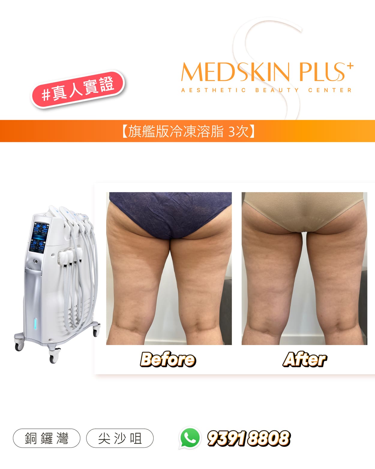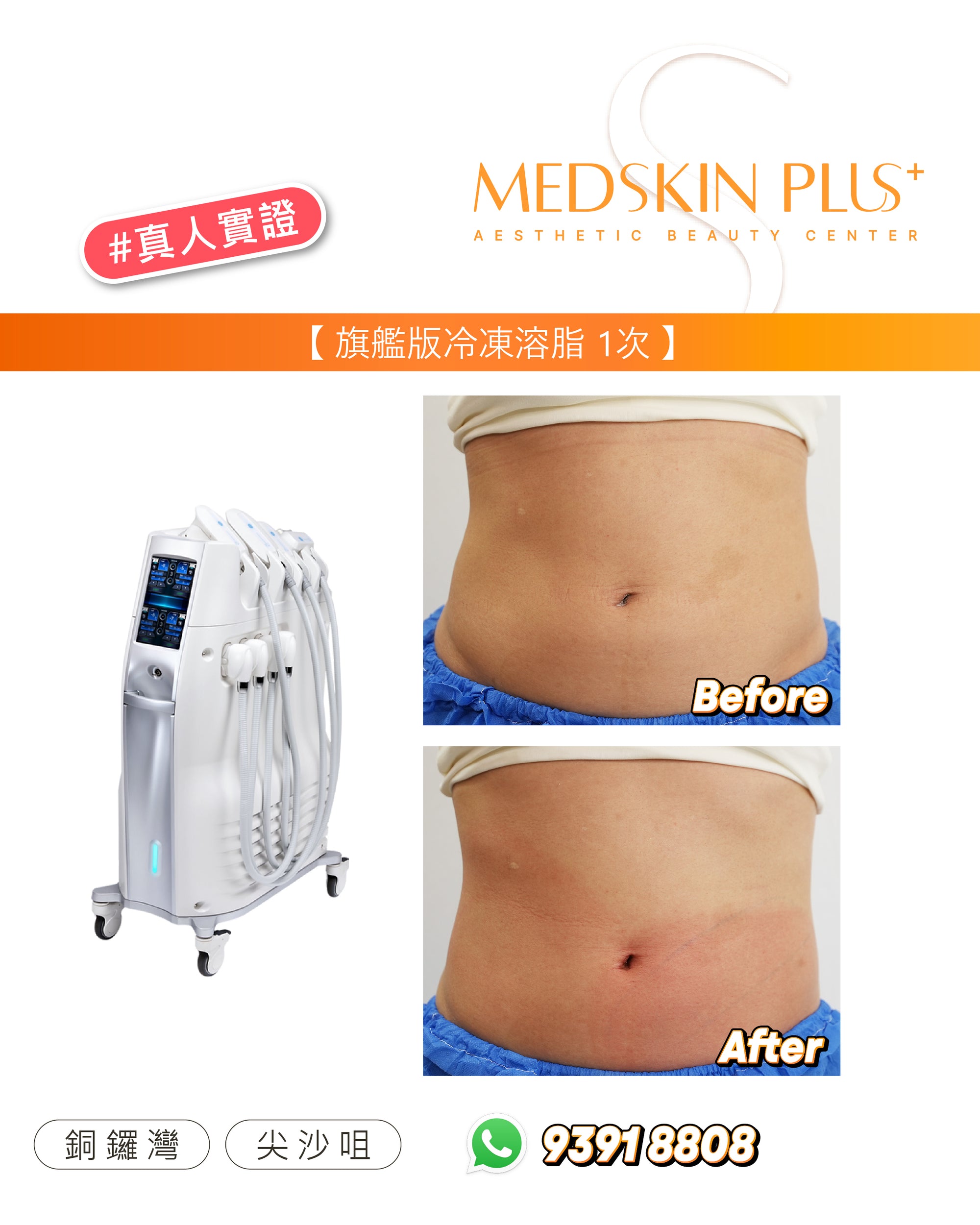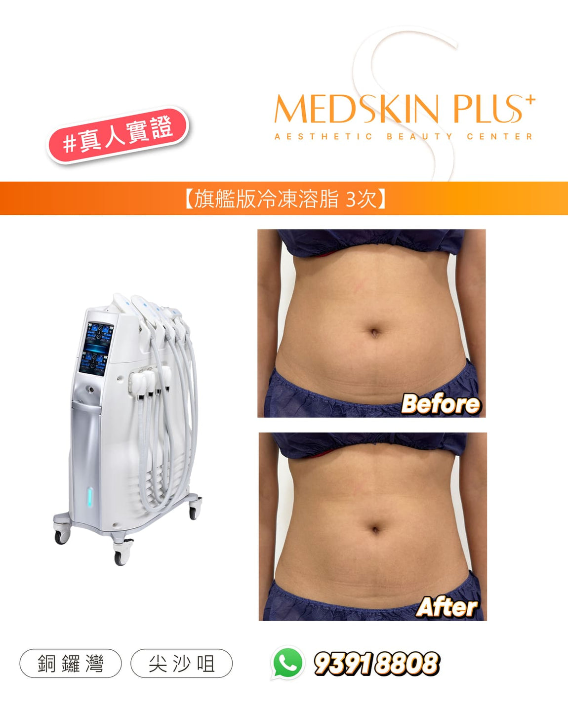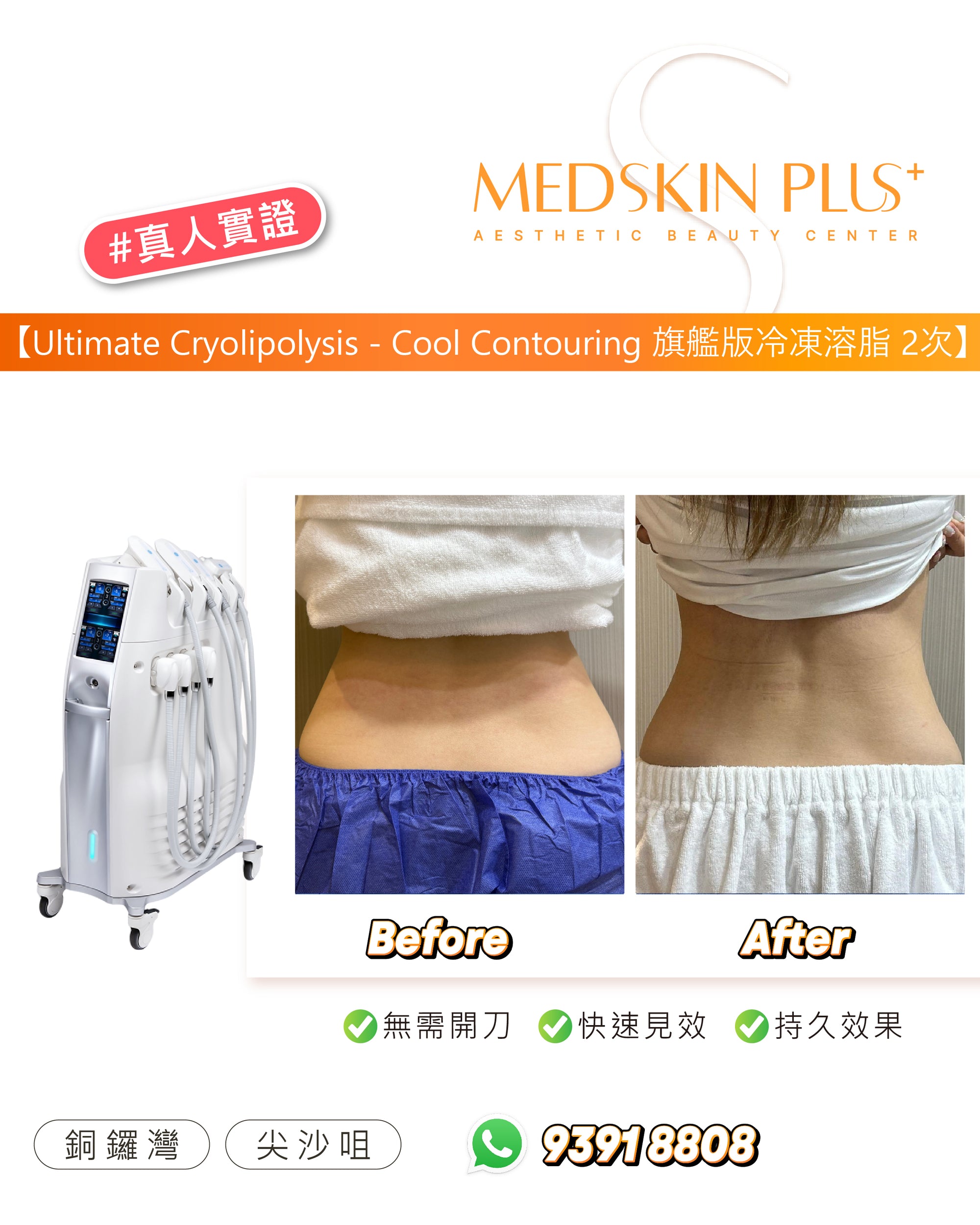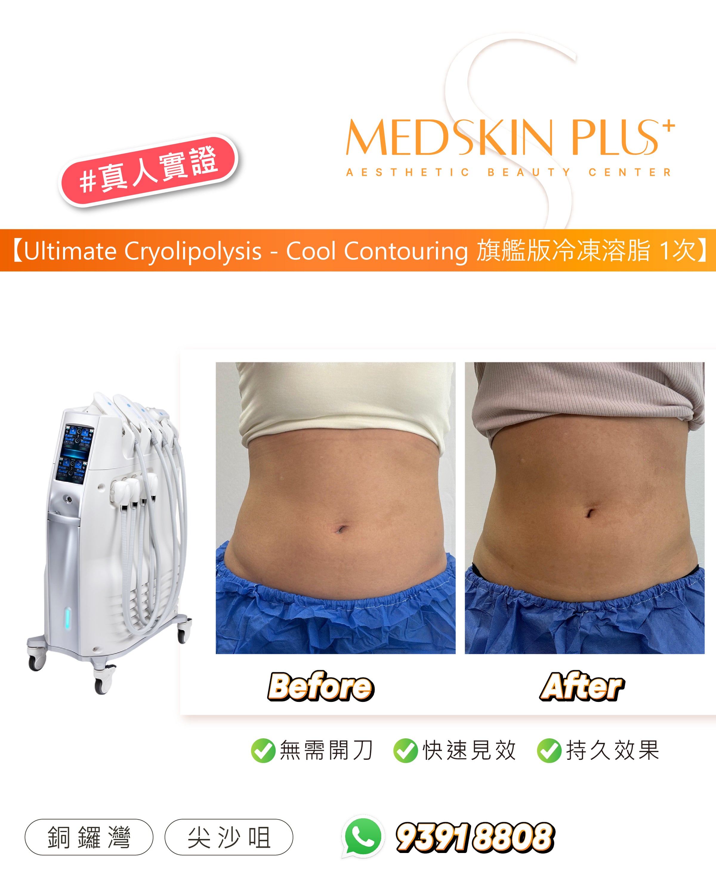 Ultimate Cryolipolysis - Cool Contouring 冷凍溶脂是美國 FDA 認可的非侵入式減脂美容儀器。透過精準控制溫度,選擇性凍死皮下脂肪細胞,並由身體自然代謝排除。效果約在 2–3 個月逐步顯現,平均可減少該部位脂肪約 20–25%。歡迎參考以下案例圖片,了解一次及三次療程後的前後差異: