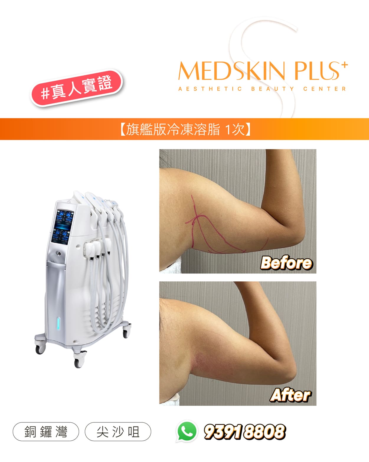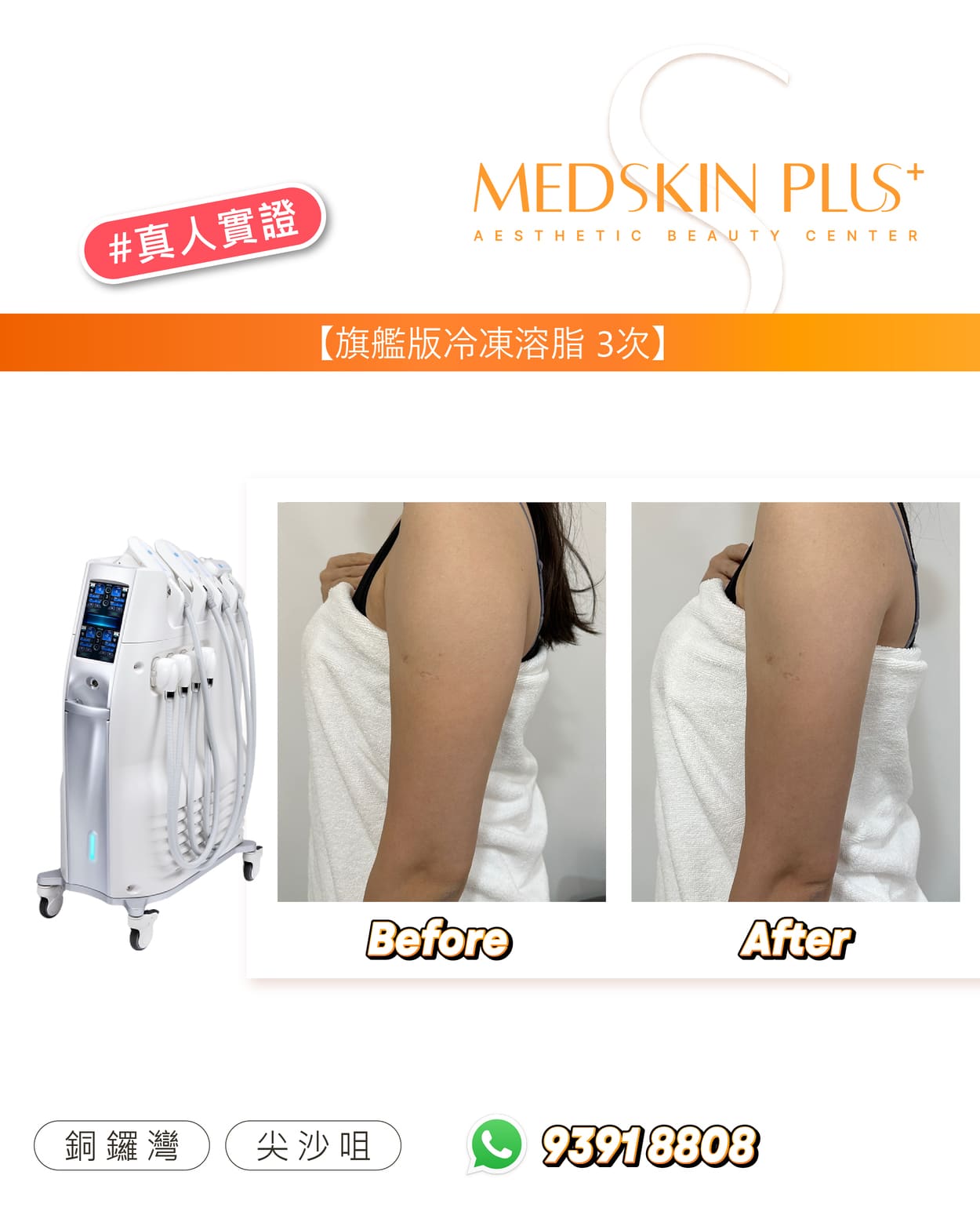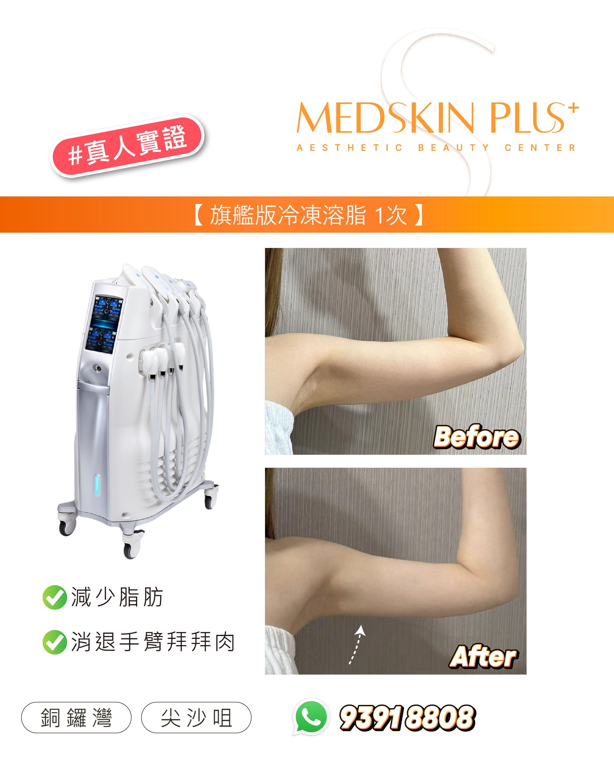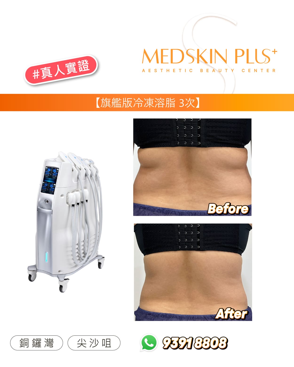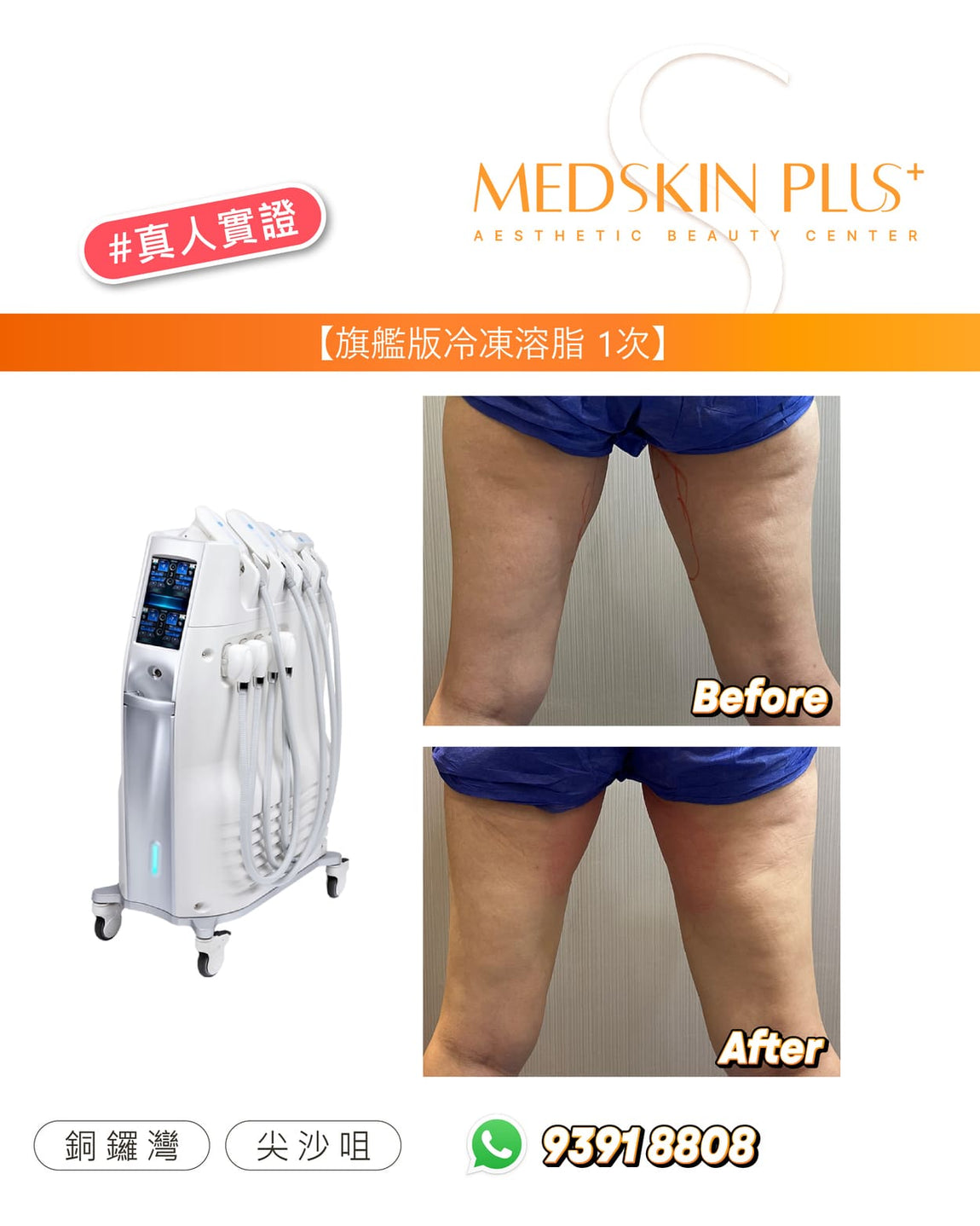Ultimate Cryolipolysis - Cool Contouring 冷凍溶脂是美國 FDA 認可的非侵入式減脂美容儀器。透過精準控制溫度,選擇性凍死皮下脂肪細胞,並由身體自然代謝排除。效果約在 2–3 個月逐步顯現,平均可減少該部位脂肪約 20–25%。歡迎參考以下案例圖片,了解一次及三次療程後的前後差異: